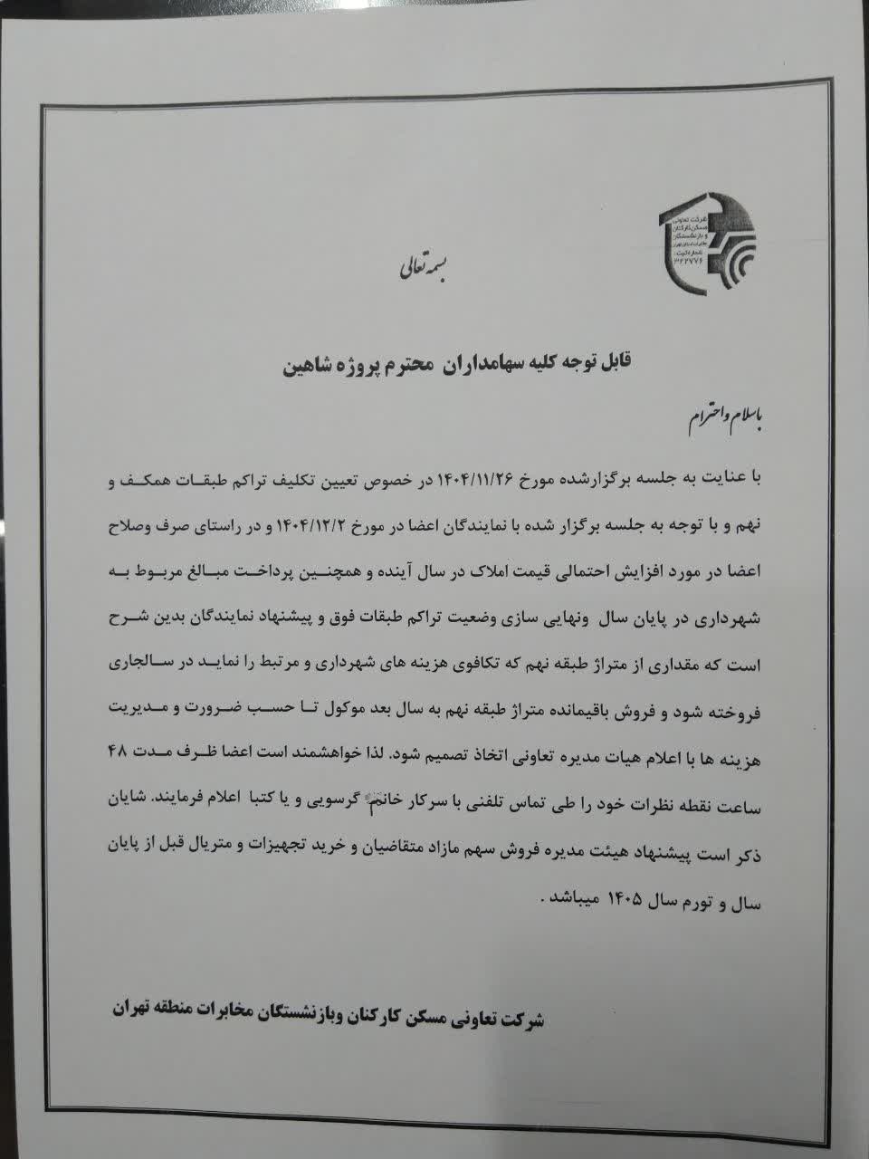 اطلاعیه سهامداران محترم پروژه شاهین 1404/11/27