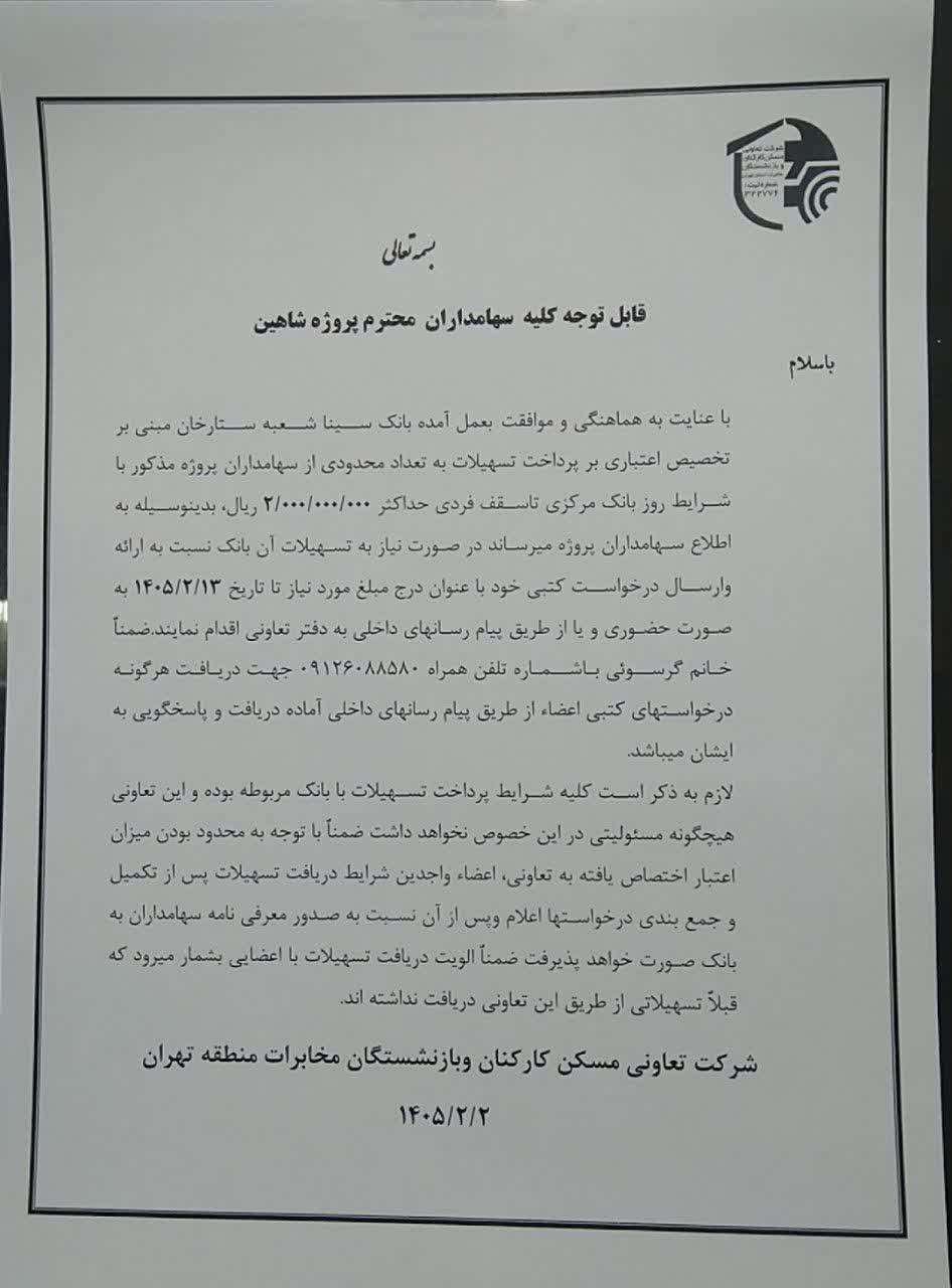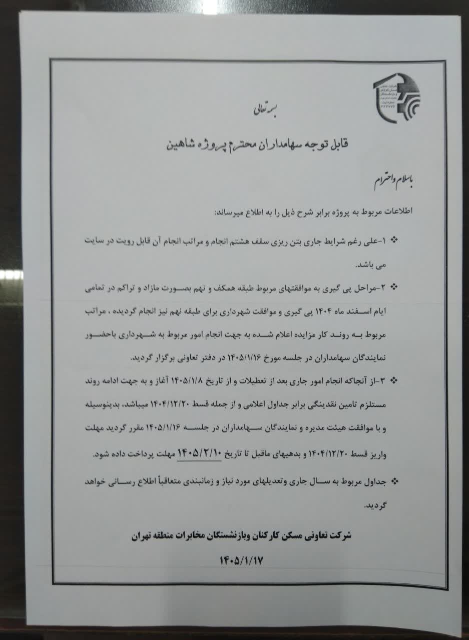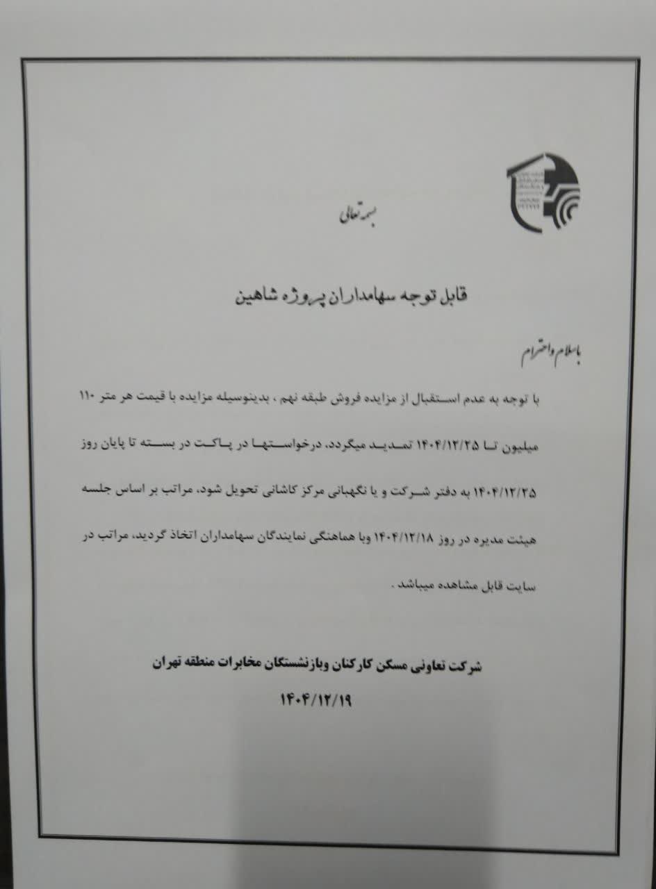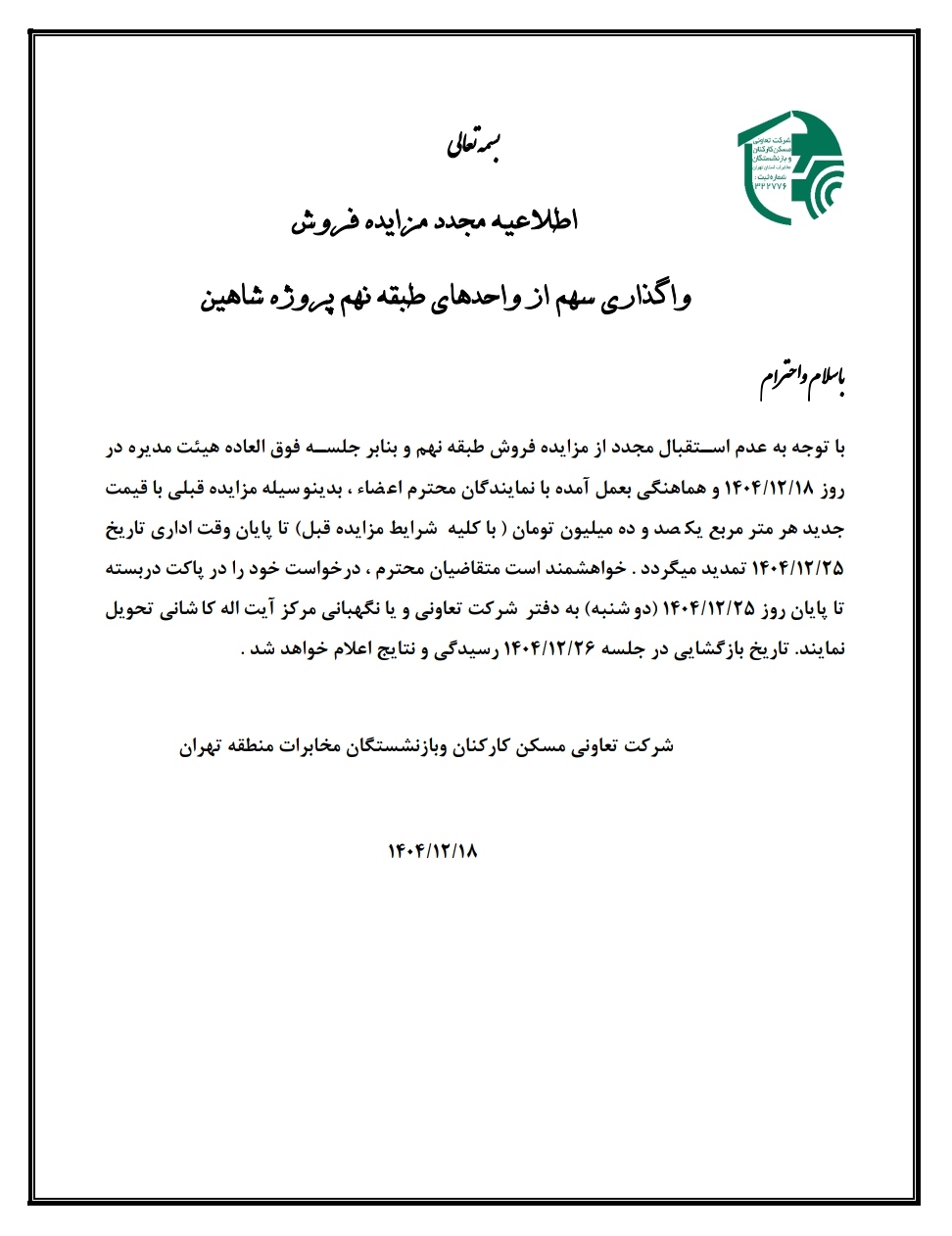 قابل توجه کلیه سهامداران محترم پروژه شاهین باسلام واحترام با توجه به عدم استقبال مجدد از مزایده فروش طبقه نهم