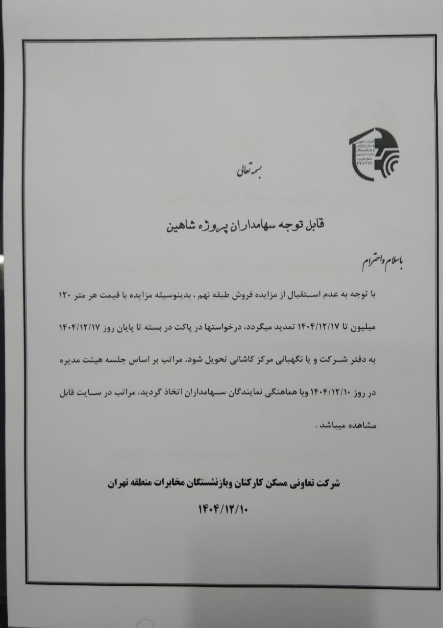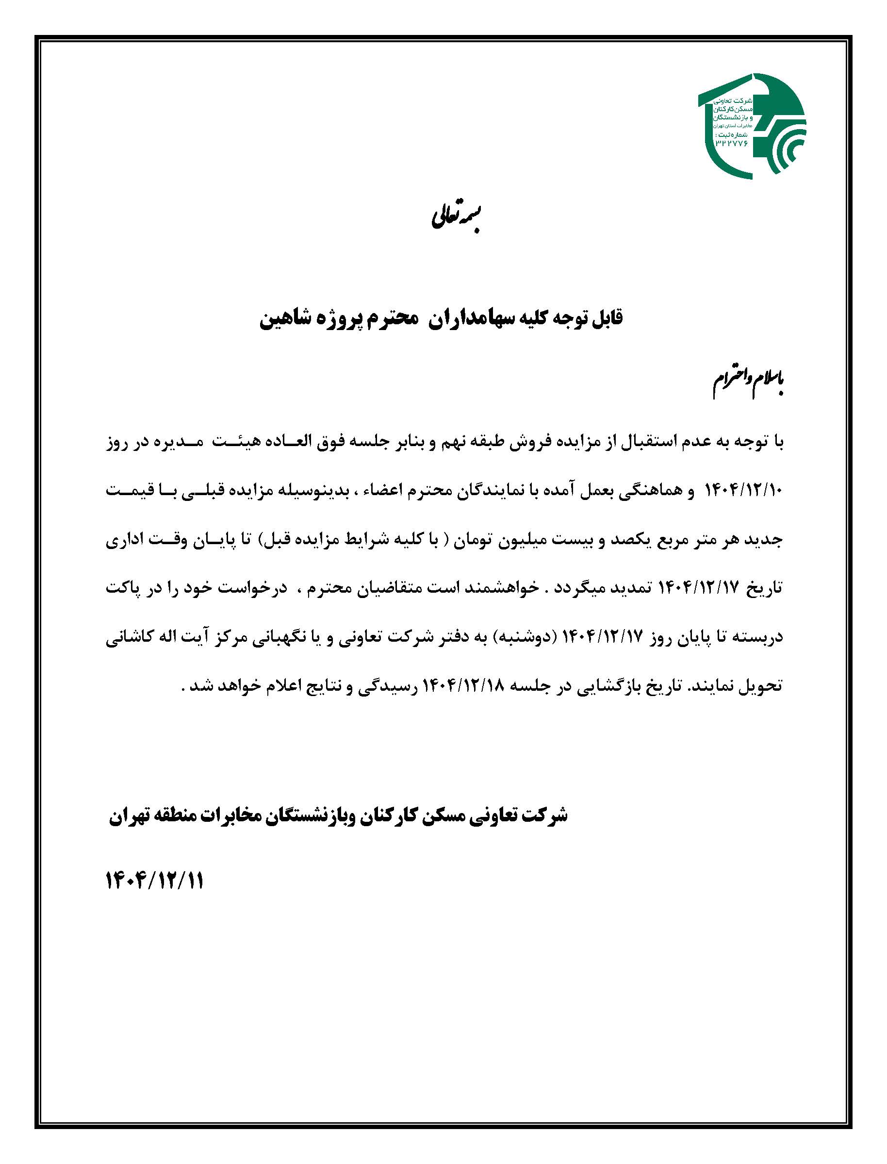قابل توجه کلیه سهامداران محترم پروژه شاهین باسلام واحترام با توجه به عدم استقبال مجدد از مزایده فروش طبقه نهم